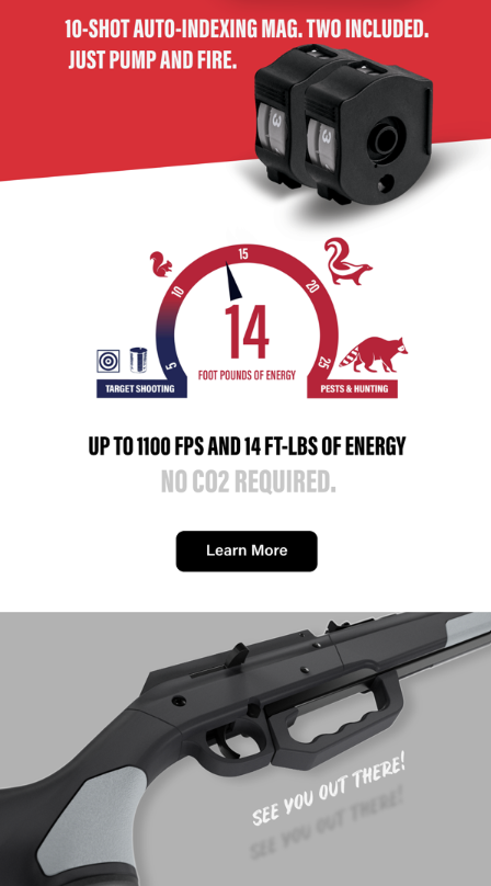 Crosman’s latest multi-pump delivers speeds up to 1100 FPS, two 10-shot auto-indexing magazines, and fiber optic front with adjustable rear sights—locked in and ready when you are.